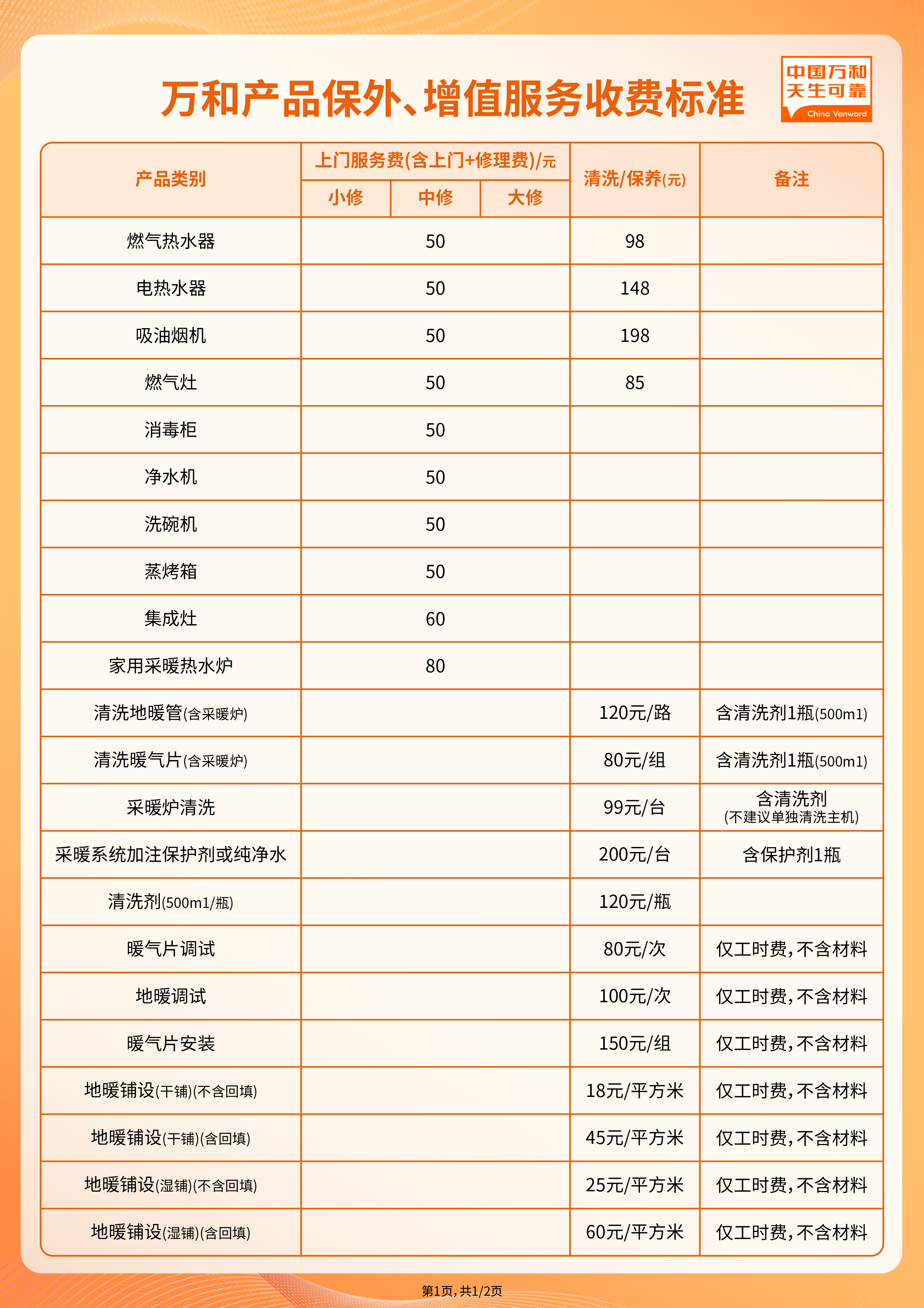 二、萬和產(chǎn)品保外服務(wù)管理及收費標準